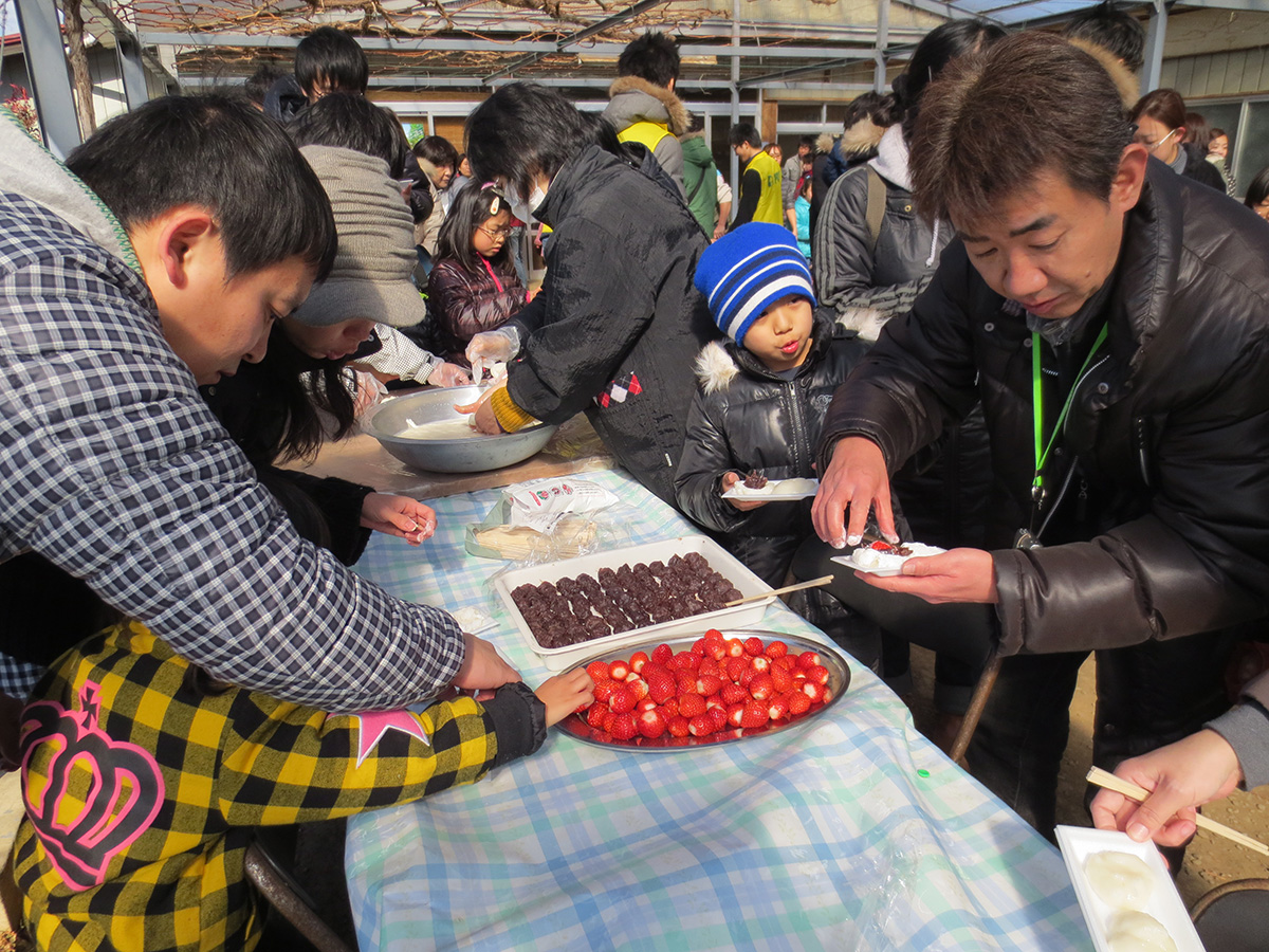 ※いちご狩りの季節の「もちつきサービス」(20名様以上のお申込みの場合)につきましては、つみ取ったイチゴをつきたてのお餅と絡め、いちご大福として召し上がっていただく事も出来ます。